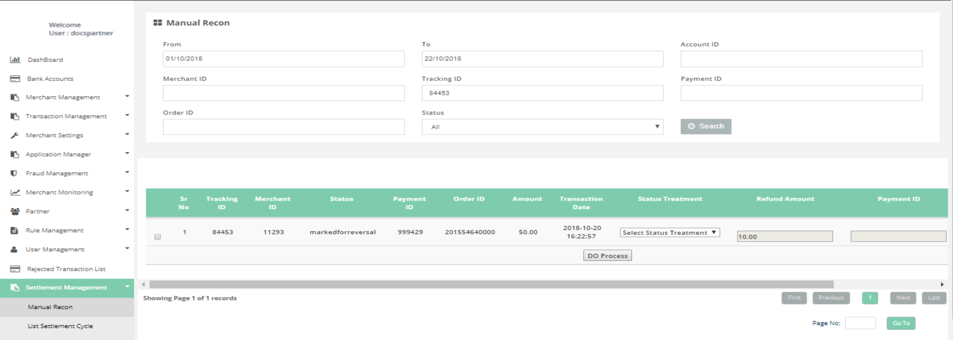 After login, you need to click on “Manual Recon" section under " Settlement Management" tab in the left navigation panel of Partner's back office