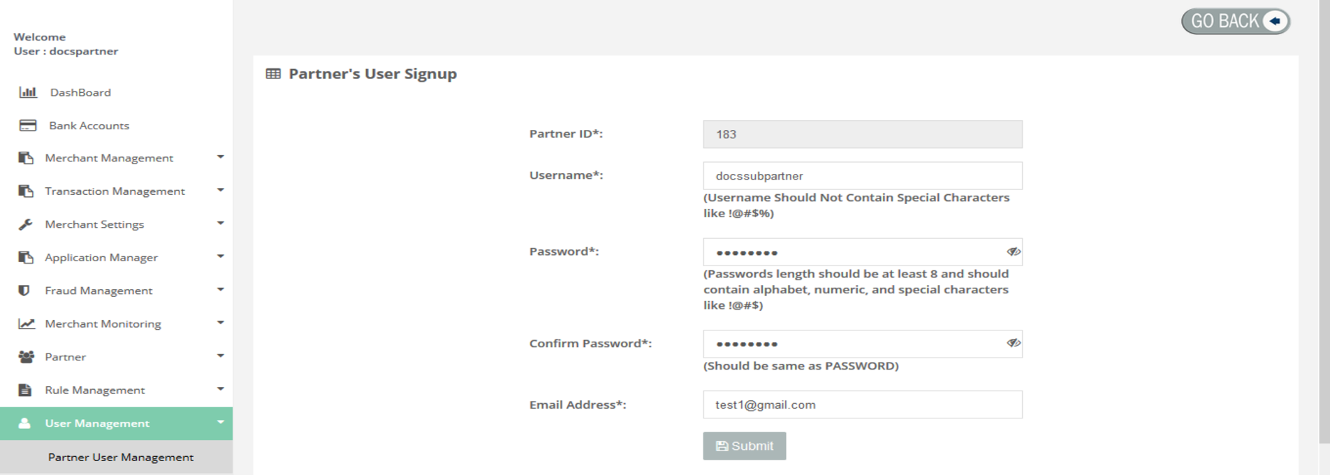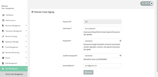 After Login, you need to click on the "Partner User Management" section under "User Management" tab in the left navigation panel of Partner's back office and then you need to click on "view" button.