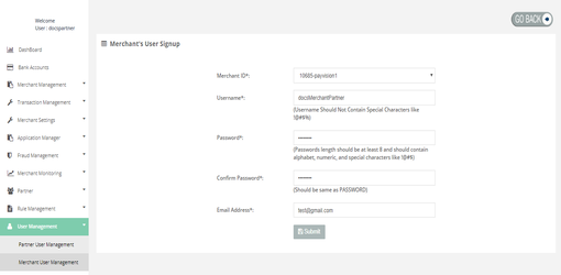 After Login, you need to click on the "Partner User Management" section under "User Management" tab in the left navigation panel of Partner's back office and then you need to click on "Add New User" button which is situated at rightmost top of the search filter.