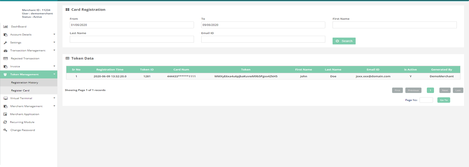 After login you need to click on "Registration History" tab under "Token Management" section in the left navigation panel of Merchant’s back office.